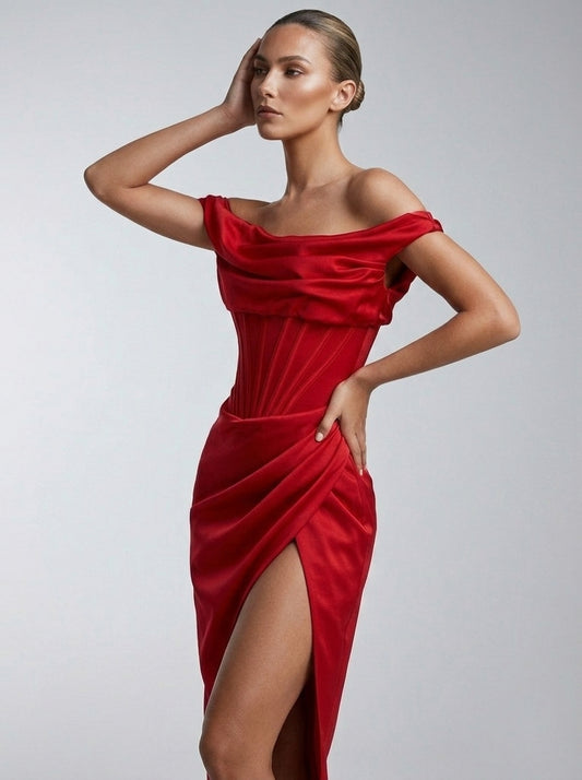 Rosalia | Rød Off-Shoulder Corset Midi Kjole Med Slids