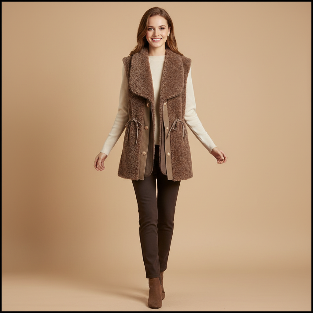Lag-på-lag vestmed snøredetaljer, der subtilt samler silhuetten
