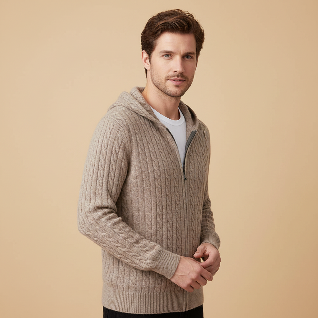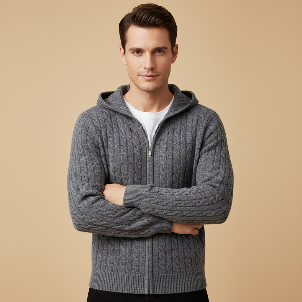 Dennecardigan med hættehar en lige, afbalanceret pasform og en gennemgående lynlåslukning foran. Det all-overkabelstrikkede mønsterdefinerer udtrykket, mens ribstrikkede kanter og den integrerede hætte skaber en genkendelig, klassisk-casual silhuet, der passer ubesværet ind i hverdagslooks.