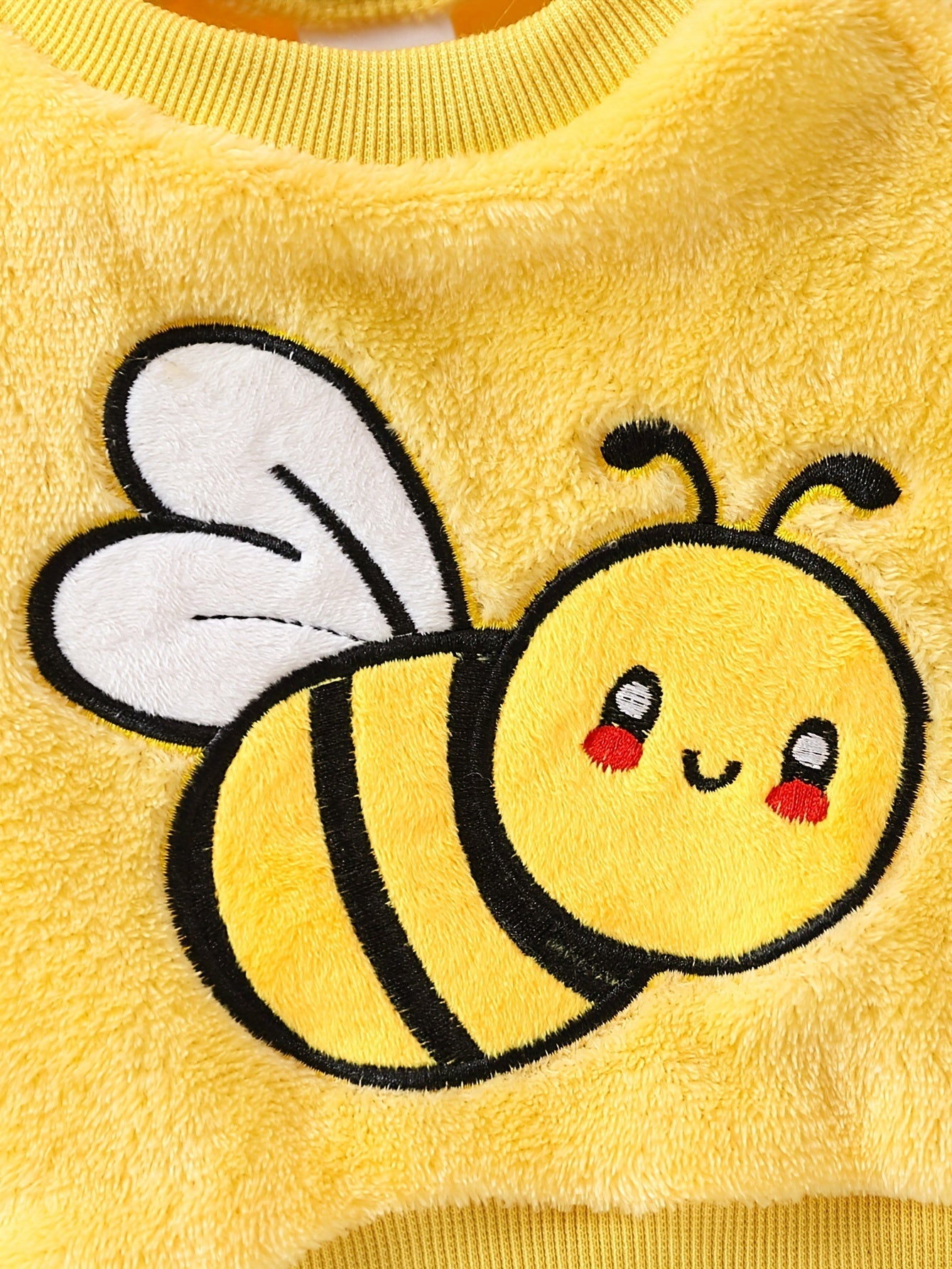 Med dette 3-delte plys babysæt får din lille én straks et komplet og muntert look. Det bløde plysmateriale føles dejligt krammevenligt, og det gule bimønster gør outfittet ekstra legende. Perfekt til kolde dage i efteråret og vinteren, både hjemme og udenfor.