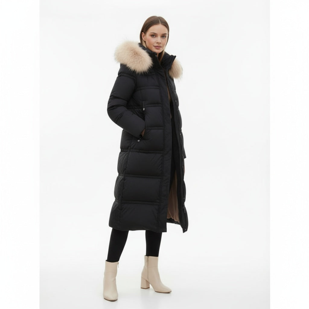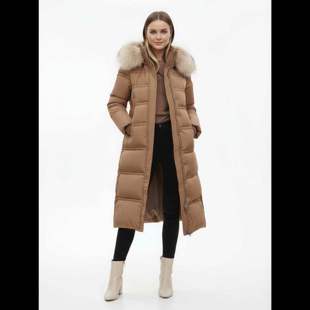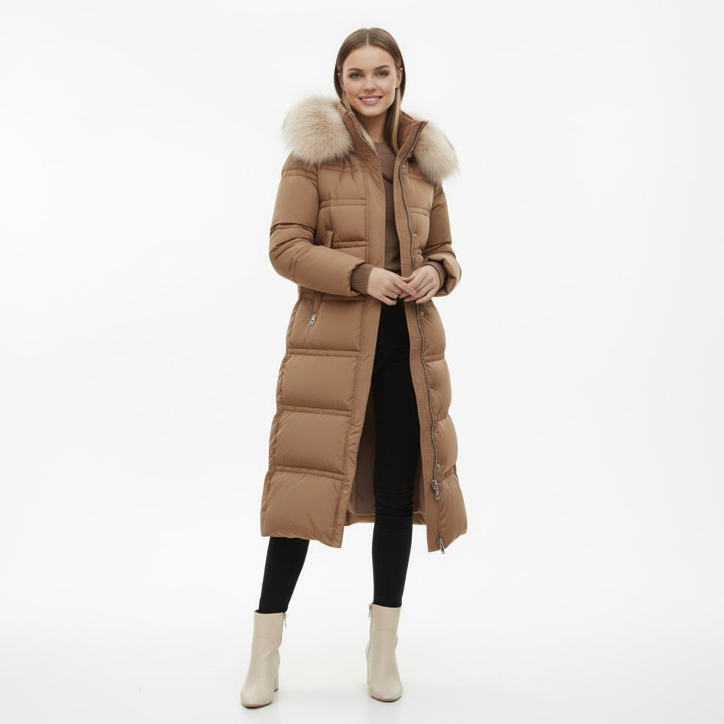 Denne lange vinterjakke giver maksimal varme og beskyttelse, mens den elegante pasform smukt fremhæver din figur. Takket være pufferstilen, hætten og den luksuriøse pelskrave kombinerer jakken funktionalitet med et raffineret udtryk.