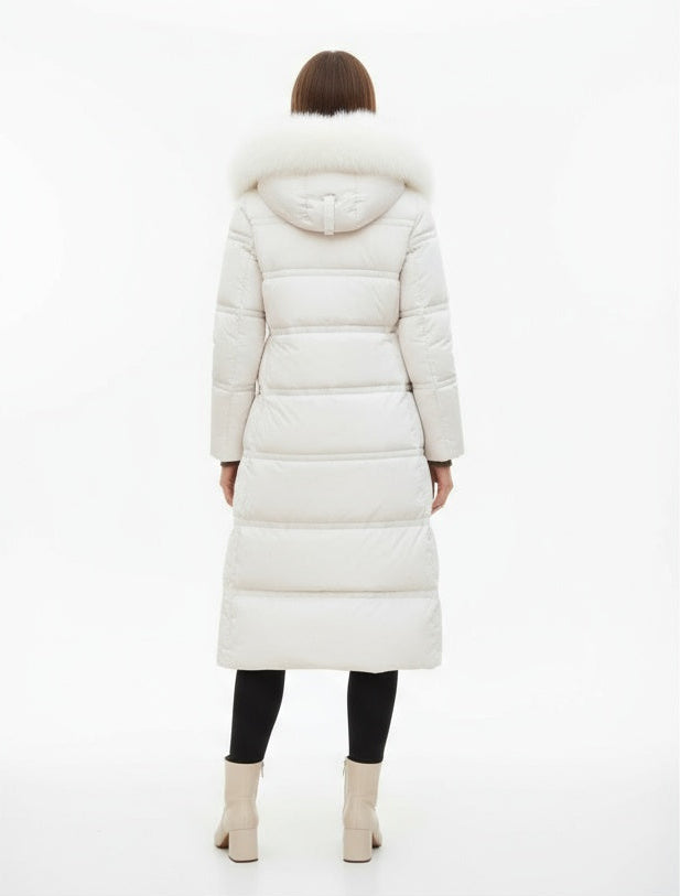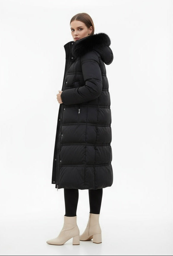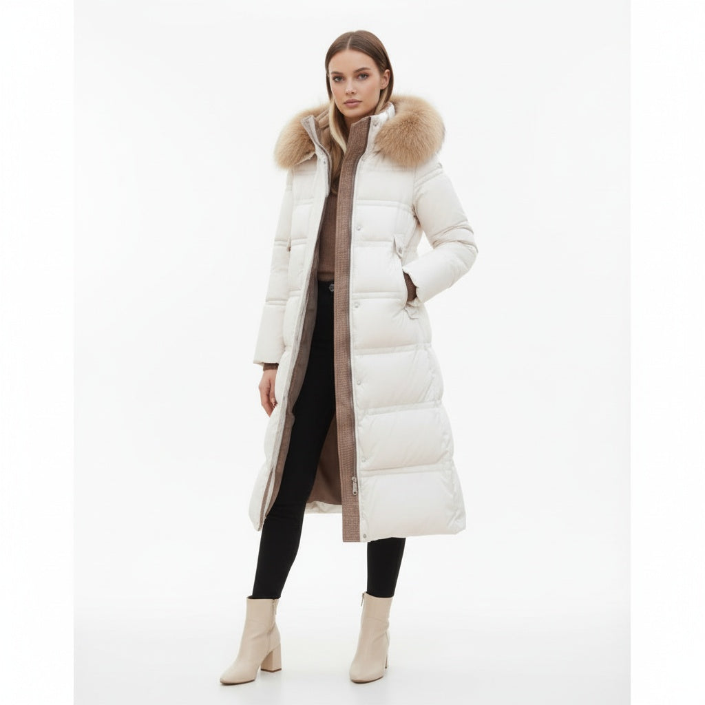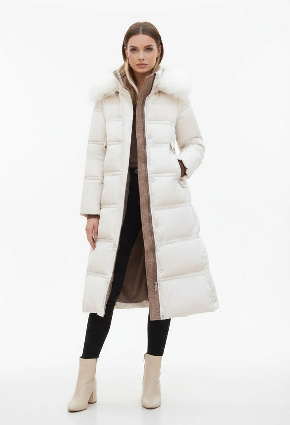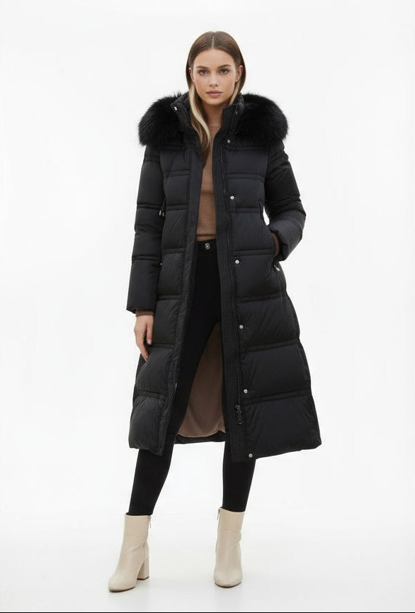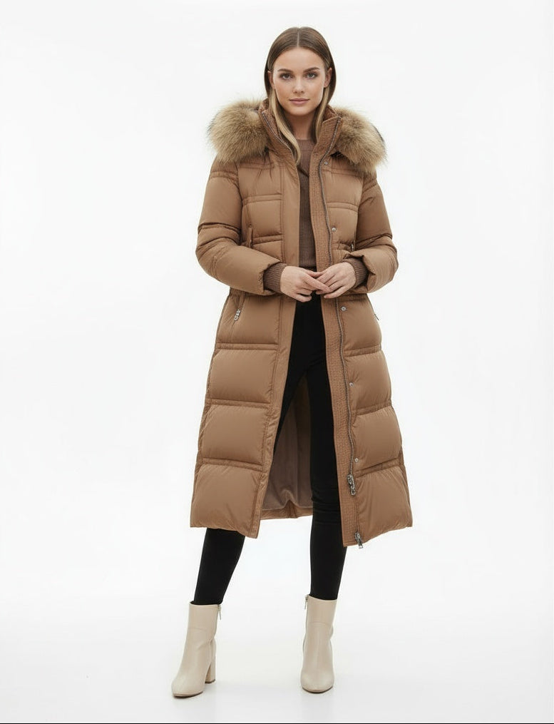 Denne lange vinterjakke giver maksimal varme og beskyttelse, mens den elegante pasform smukt fremhæver din figur. Takket være pufferstilen, hætten og den luksuriøse pelskrave kombinerer jakken funktionalitet med et raffineret udtryk.