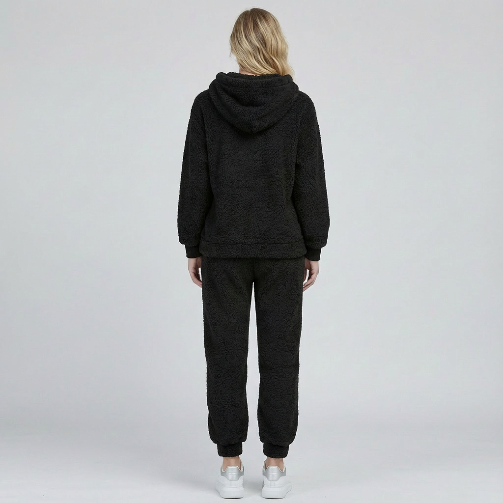 Dette teddy lounge sæt er skabt til at give dig en varm og omsluttende følelse, så snart du tager det på. Kombinationen af en oversized hoodie med hætte og en blødt faldende buks giver et afslappet silhuet, der er perfekt til hjemmedage, aftener på sofaen og rolige weekender. Det bløde teddy-/fleece-lignende materiale føles fluffy, holder på varmen og gør hvert øjeblik ekstra behageligt.