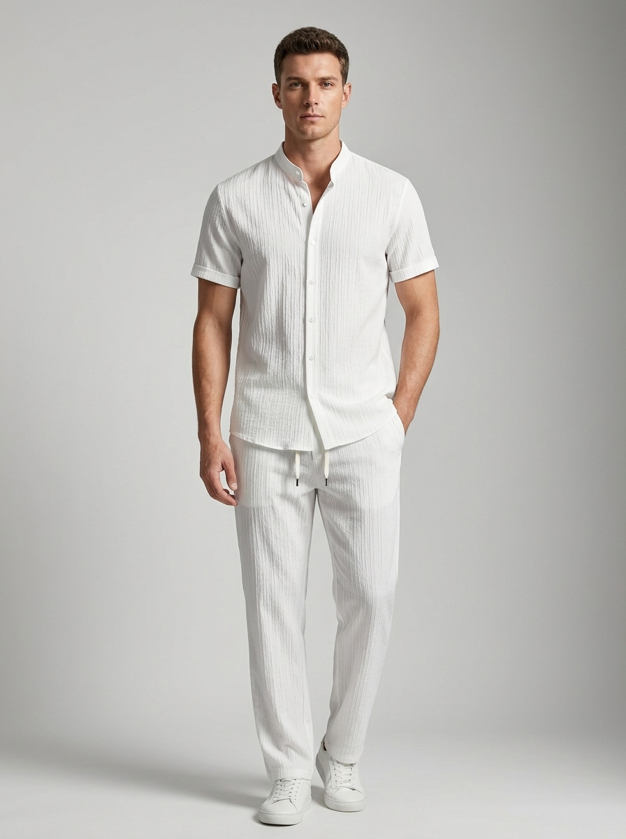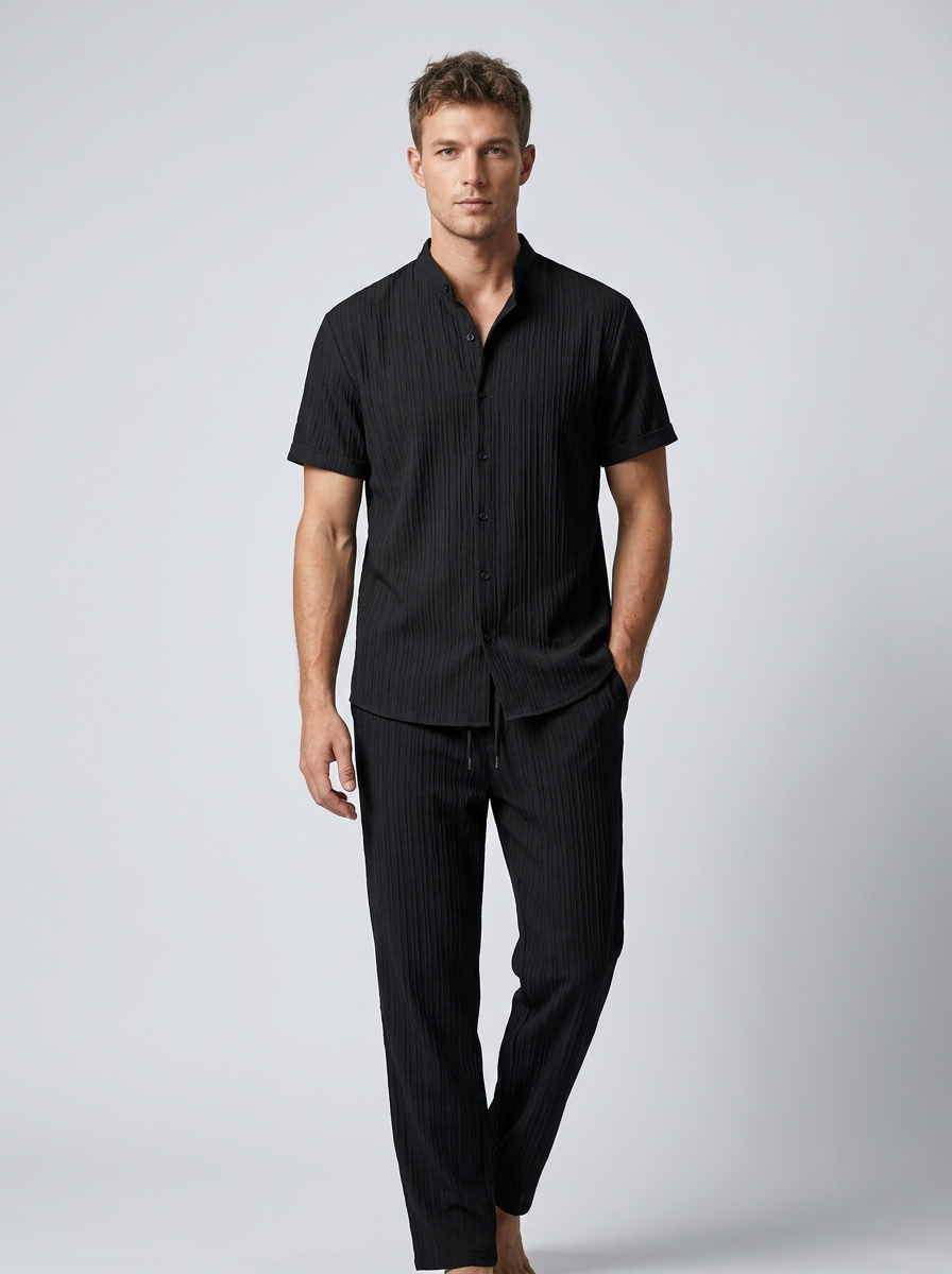 Leder du efter et outfit, hvor du både ser afslappet og stilfuld ud? Darian hør sættet er designet til mænd, der elsker enkelhed med et sofistikeret udtryk. Den subtile tekstur i stoffet tilføjer dybde til looket, mens den løse pasform og det åndbare materiale gør det perfekt til varme dage eller afslappede øjeblikke. Dette er ikke et gennemsnitligt sommersæt – det er next level casual.