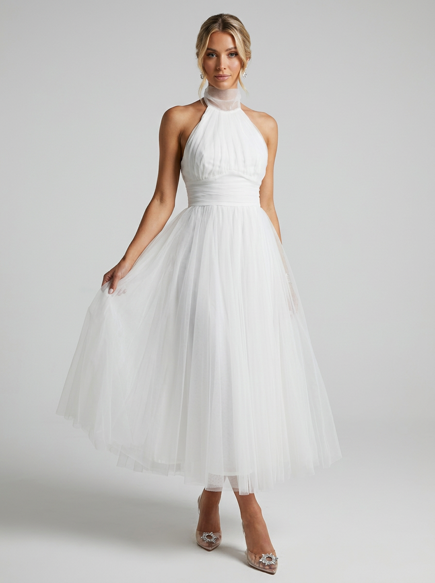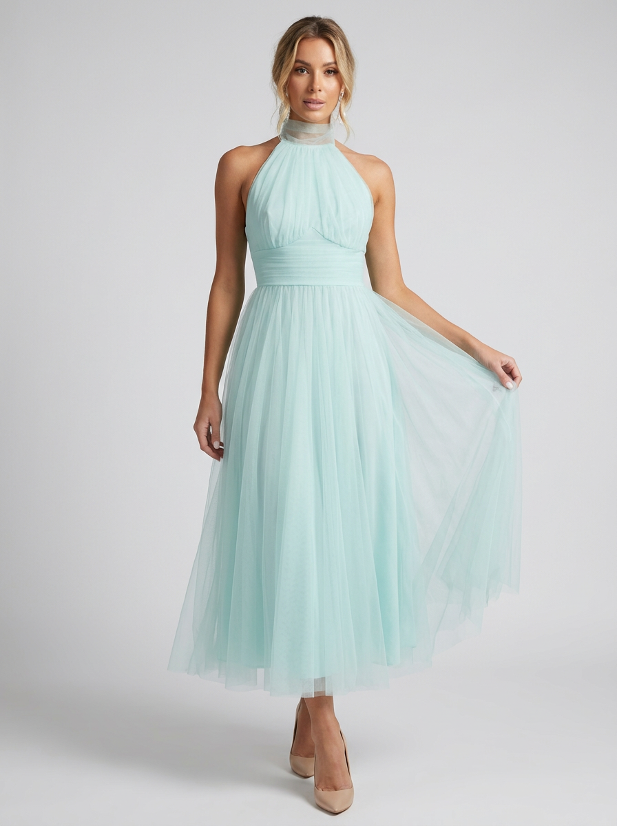 Halterneck med høj hals – Den åbne skulderlinje giver kjolen en karakteristisk dame halterneck kjole silhuet.