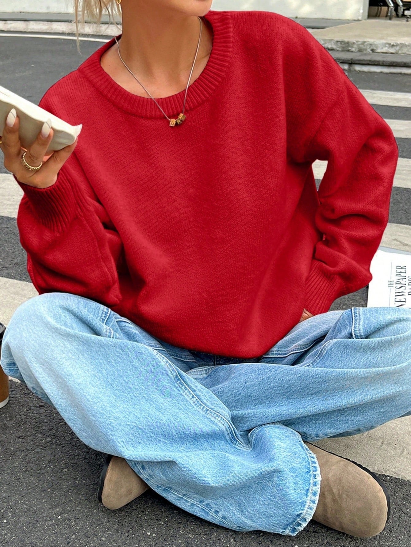 Nora oversized striktrøjen er en must-have basic til efterår og vinter. Med sin bløde strikkede kvalitet, løse pasform, runde hals med ribkant og sænkede skuldre giver denne trøje ultimativ komfort med et minimalistisk, trendy udtryk. Fås i creme, sort, pastelrosa, lyseblå og rød – ideel til både casual og chic styling.