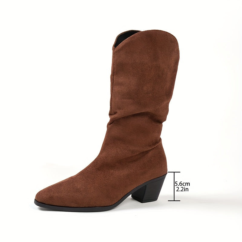 Disse støvler i ruskindslook er en ægte blikfang for denne sæson. Med deres mellemhøje skaft, spidse snude og subtile folder udstråler du ubesværet en afslappet, men stadig stilfuld vibe. Perfekte til dig, der elsker et trendy western-inspireret look, som både er råt og chic.