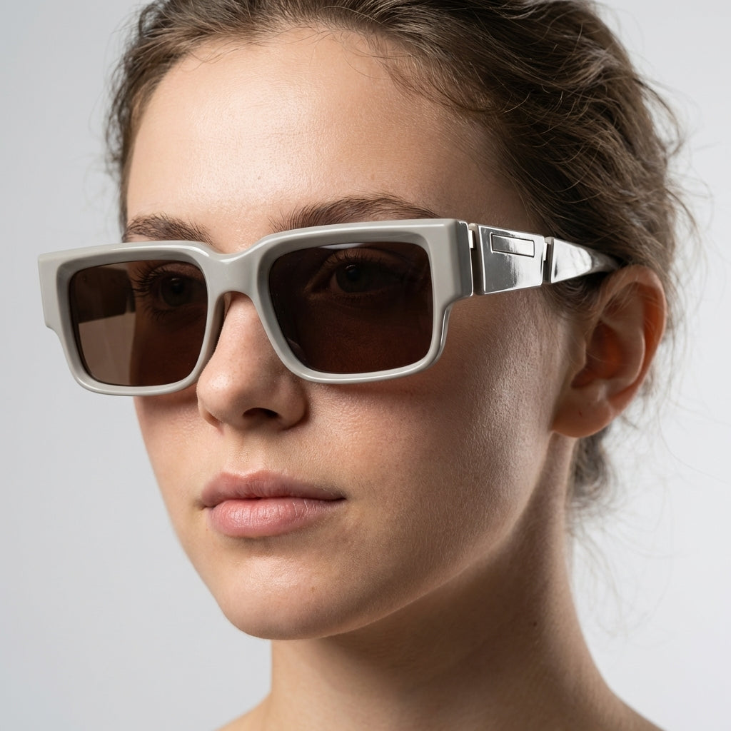 - Firkantede solbriller med geometrisk silhuet skaber et tydeligt og genkendeligt modeudtryk.