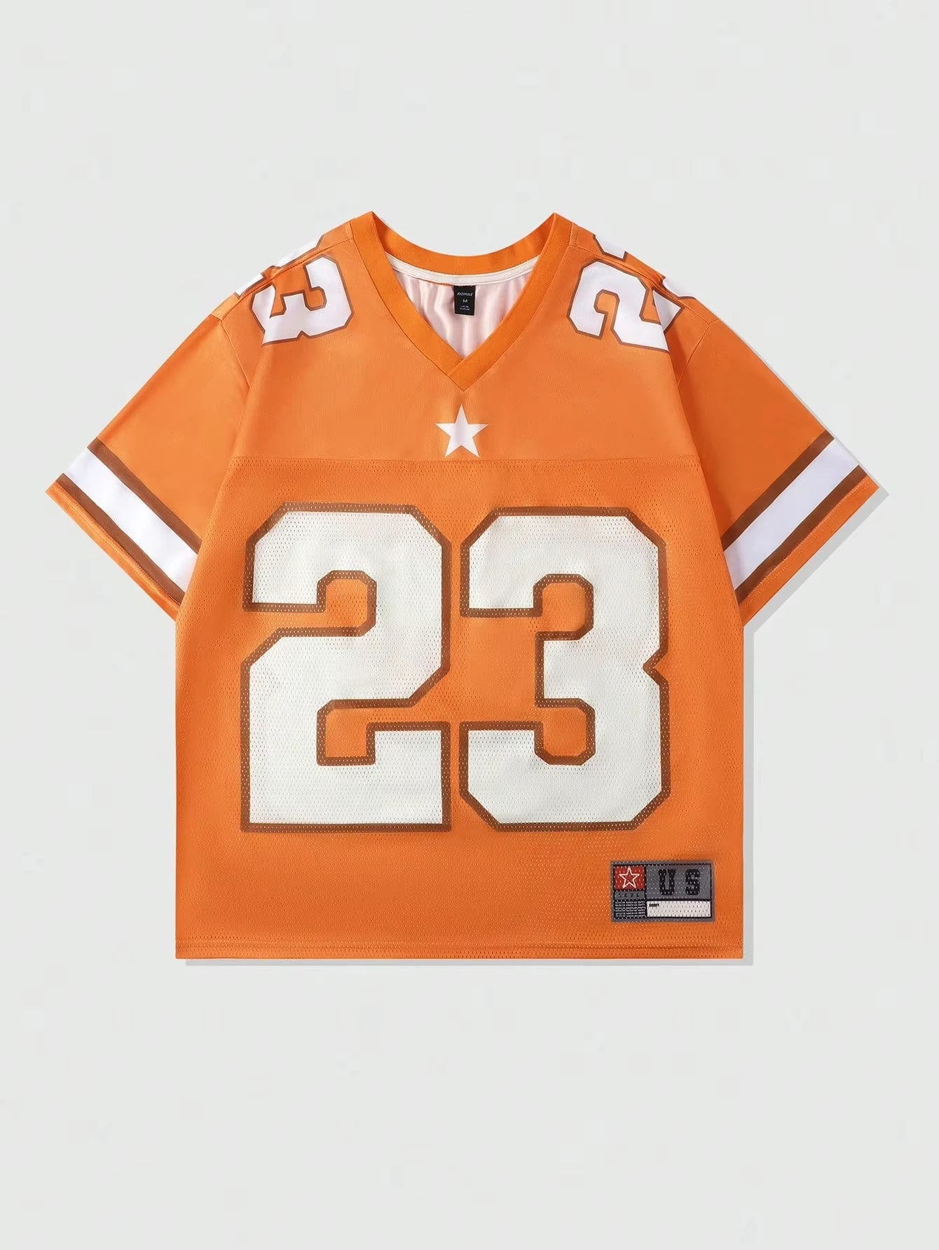Zyra er ikke bare en top – det er dit sporty power piece. Med den åndbare mesh-krop, oversized pasform og ikoniske '23'-print bringer denne jersey det bedste fra amerikansk fodbold ind i dit streetwear-look. Varsity-striberne og stjernerne på skuldrene giver et iøjnefaldende retro twist – perfekt til alt fra festival til spejldans.
